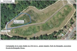 proche de la rivière Peugue (voir carte). Parmi elles, on compte 8 plantes médicinales connues et reconnues, de l’achille millefeuille à la moutarde des champs. Je rappelle ici que la Forêt du Bourgailh est un Espace Naturel Sensible, il est donc strictement interdit de cueillir quoi que ce soit. Aussi, dans le cadre d’une valorisation de la prairie humide afin de mieux faire connaître les potentiels de cet ENS via une approche affective et de mieux les préserver, j’engage les hypothèses suivantes :