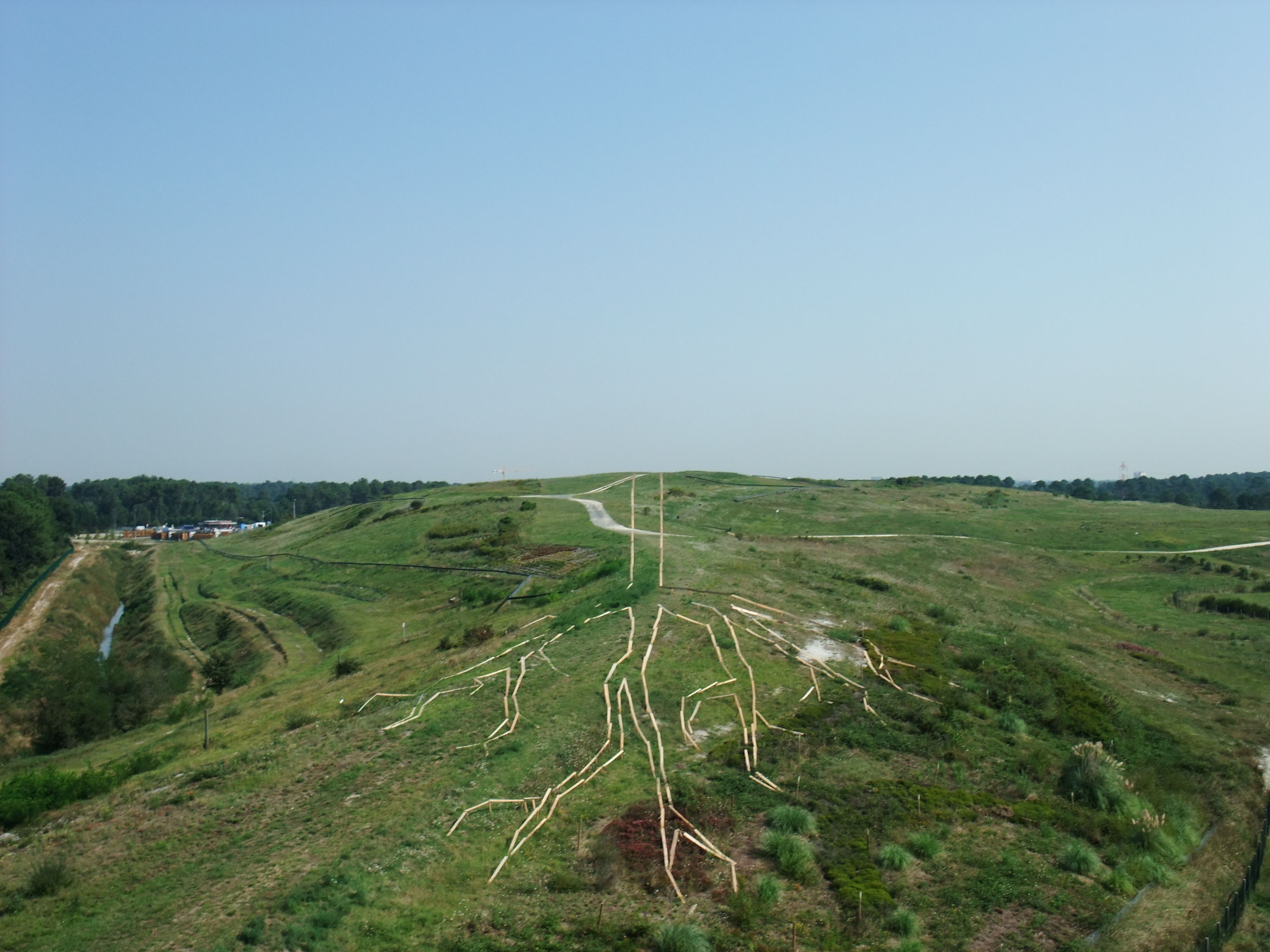 Il s’agit d’une anamorphose (l’œuvre prend forme d’un seul point de vue : le haut du belvédère de la colline) interactive : prenez la en photo et complétez l’arbre !